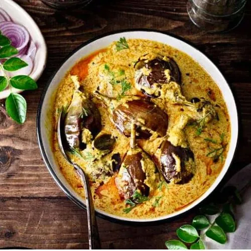 a savory Hyderabadi dish featuring tender eggplants cooked in a spiced.