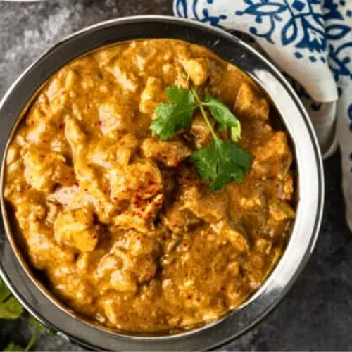 a rich, flavorful dish with tender chicken cooked in a spiced, creamy sauce.