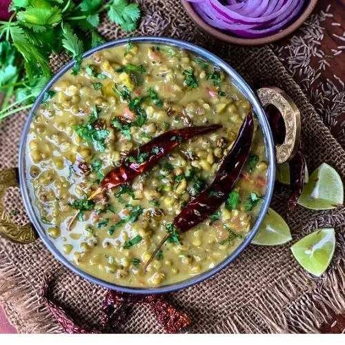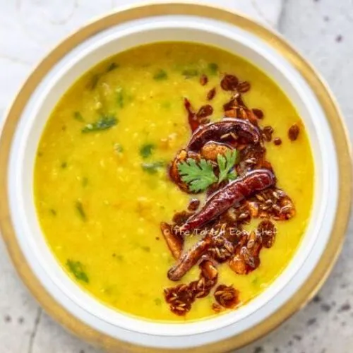 a comforting Indian dish of cooked lentils flavored with a tempering of spices, onions, and garlic.