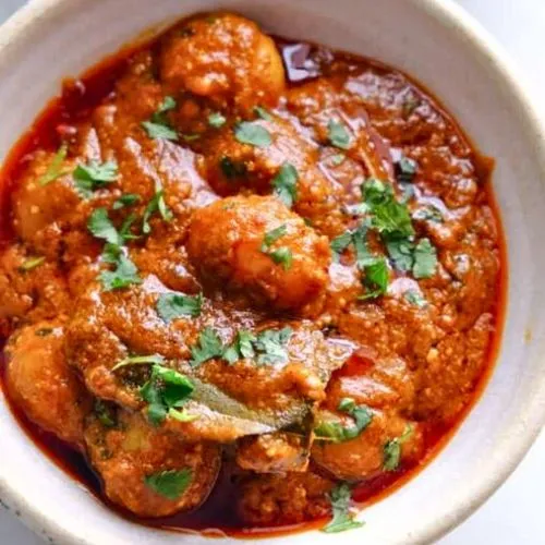 a flavorful dish of baby potatoes simmered in a spiced yogurt gravy.