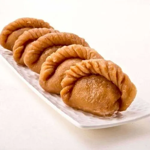 a delectable Indian dessert made from deep-fried dough filled with sweetened khoya, perfect for festive celebrations.