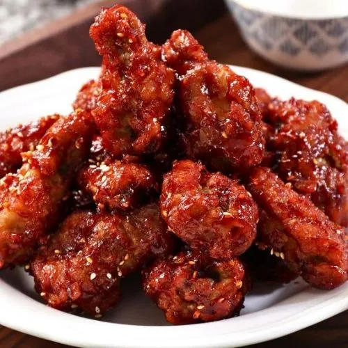 a spicy, vibrant dish with a bold red marinade and flavorful seasoning.
